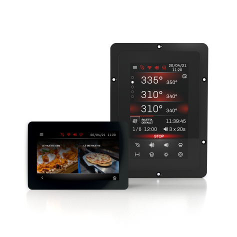 Vcolor 378 is a controller for electric bread and pizza deck ovens with a remote touch-screen user interface in 5- or 7-inch glass (available in both vertical and horizontal version) which fits in perfectly with the design of the unit. It can control up to 5 levels through an RS-485 network of power boards connected to a single user interface, which also allows centralised management with power shared between the decks. Centralised management can also be enabled by connecting control kits (interface + power board), one for each deck and up to a maximum of 5, via the RS-485 serial port.